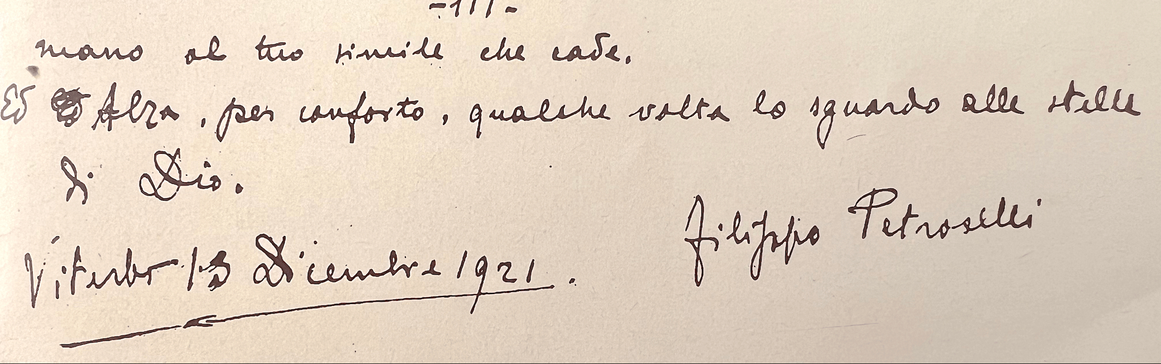 Nel 1977, su richiesta della moglie di Filippo Petroselli – Gina Altissimo -, la nipote Rosa Rossi Palange si è trovata tra le mani un insieme di fogli manoscritti e dattiloscritti da sistemare e una notevole quantità di negativi sbiaditi e fotografie ingiallite. Tra questi documenti, sono stati trovati questi pensieri. Si trattava di carte ritrovate nel suo studio che includevano, tra l’altro, i ricordi degli anni trascorsi come medico militare sul fronte libico-turco e su quello della Prima guerra mondiale (1913/14 e 1915/18 e ancora fino al 1919, trattenuto in servizio per fare fronte alla pandemia influenzale) della cui redazione autografa si trova notizia nell’epistolario intercorso ai tempi del loro fidanzamento a distanza, tra l’agosto del 1919 e il giugno del 1920. Filippo Petroselli volle scrivere sibi suisque (ossia per parenti e amici, come si desume dal profilo dedicato all’autore in Nicia. Rivista medica d’arte e varietà, luglio 1932). Solo a due anni dalla sua scomparsa la moglie ritenne di farli stampare in un numero limitato di copie per il loro valore testimoniale di aspirazione alla pace, al benessere e alla salute dell’uomo e della casa comune, la terra e tutti gli esseri che la abitano.